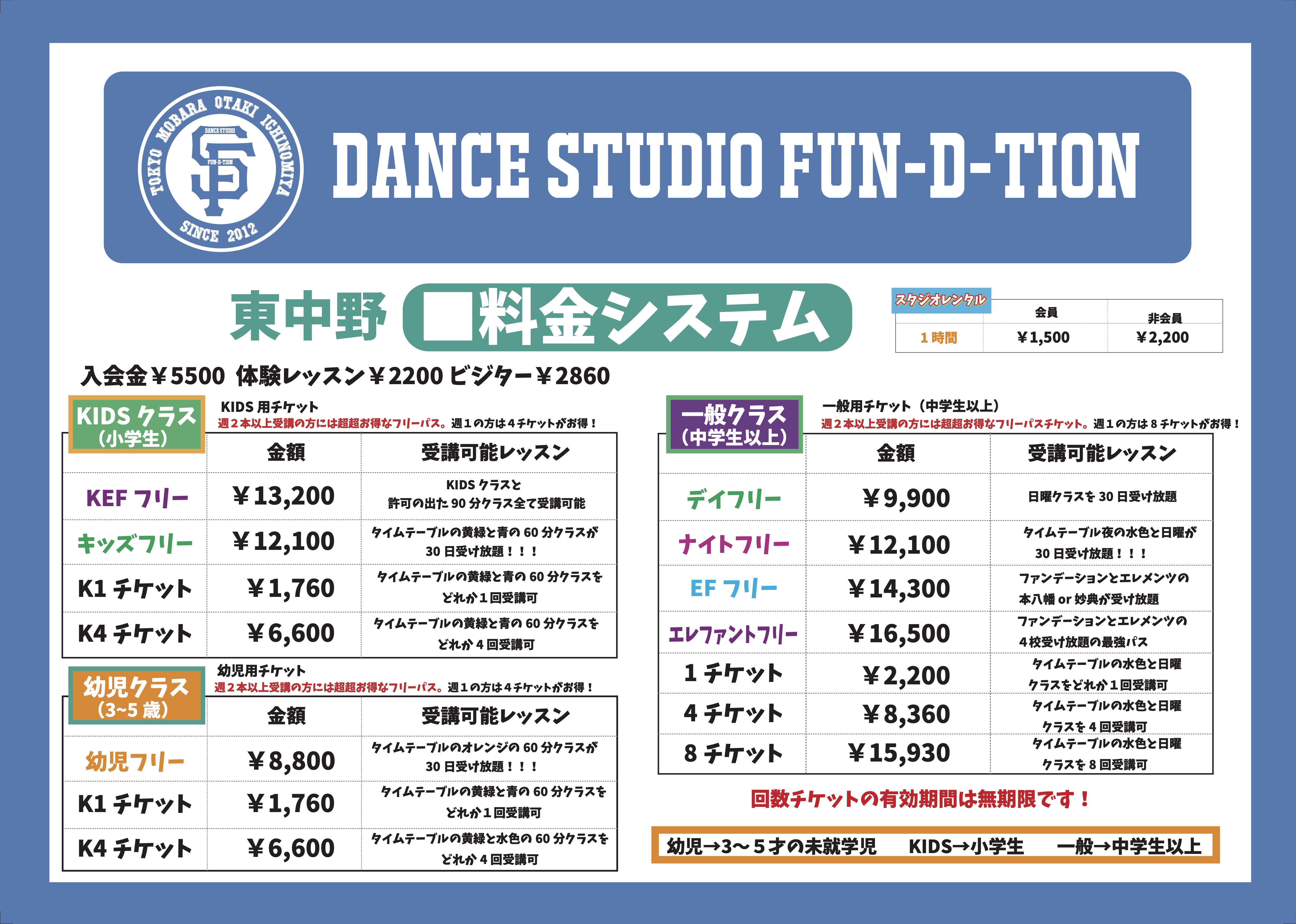 | E/Fフリー | ¥14,300 | 30日 | 提携しているスタジオELEMENTSの(妙典&本八幡)のどちらかひとつとFUN→D←TION2スタジオ(東中野&茂原)の全てのレッスン=3スタジオ月250本 週2本ペースで¥1,430 週3本で¥1,100 |